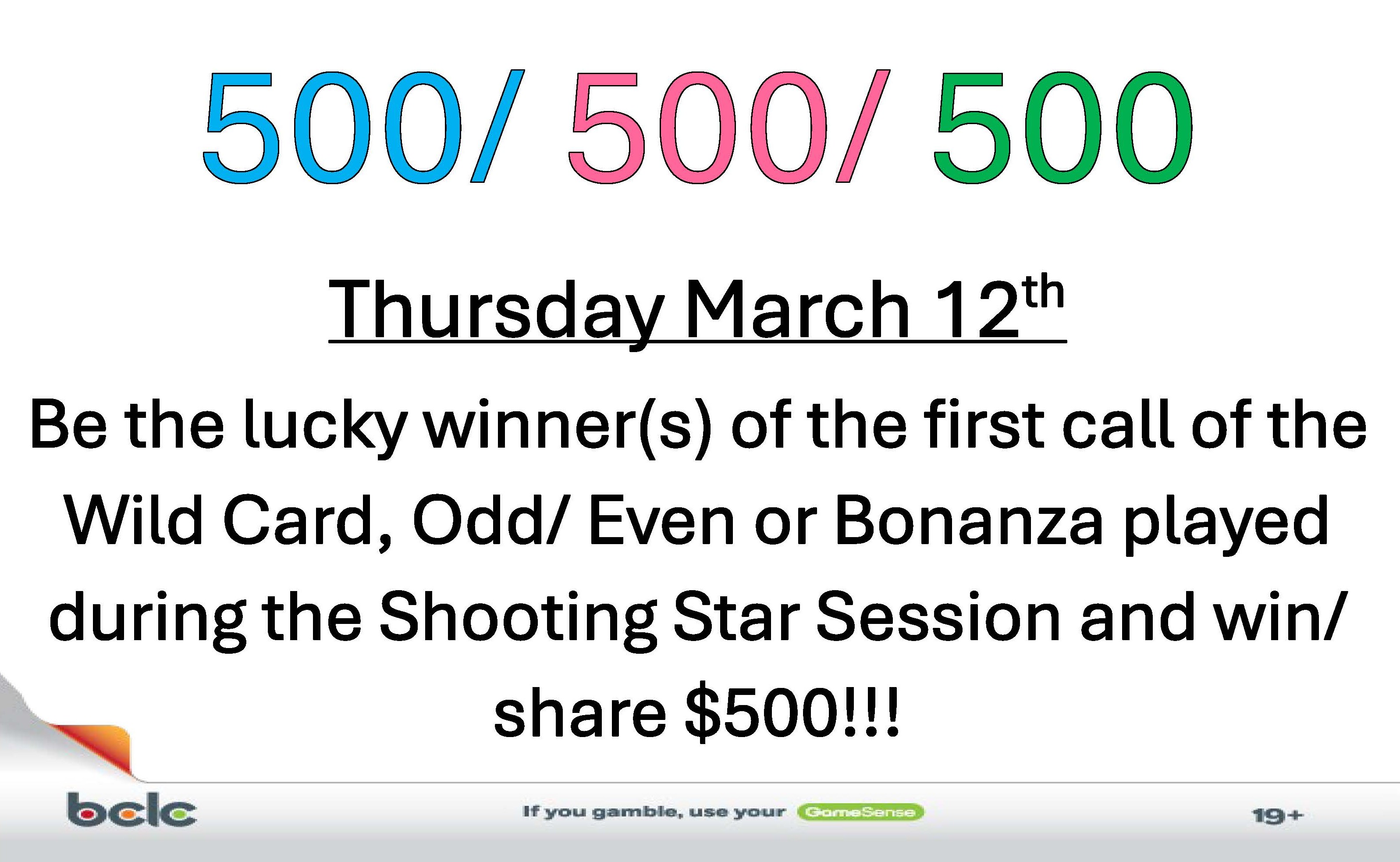 The Wild Card, Odd/ Even and Bonanza played during the Shooting Star Session payout $500 each!!!
