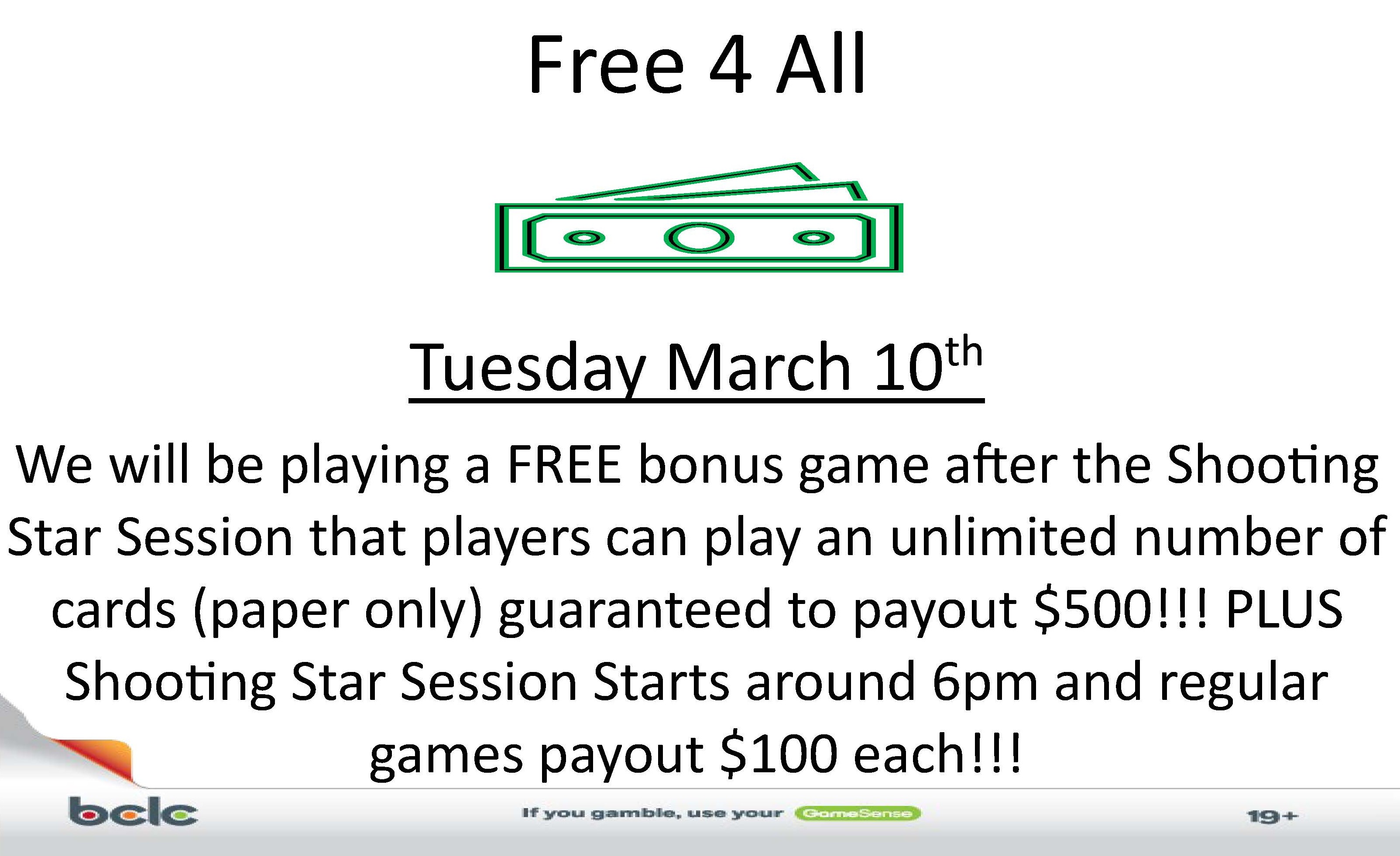 We will be playing a FREE game after the Shooting Star Session that players can play an unlimited number of cards (paper only) guaranteed to payout $500!!!