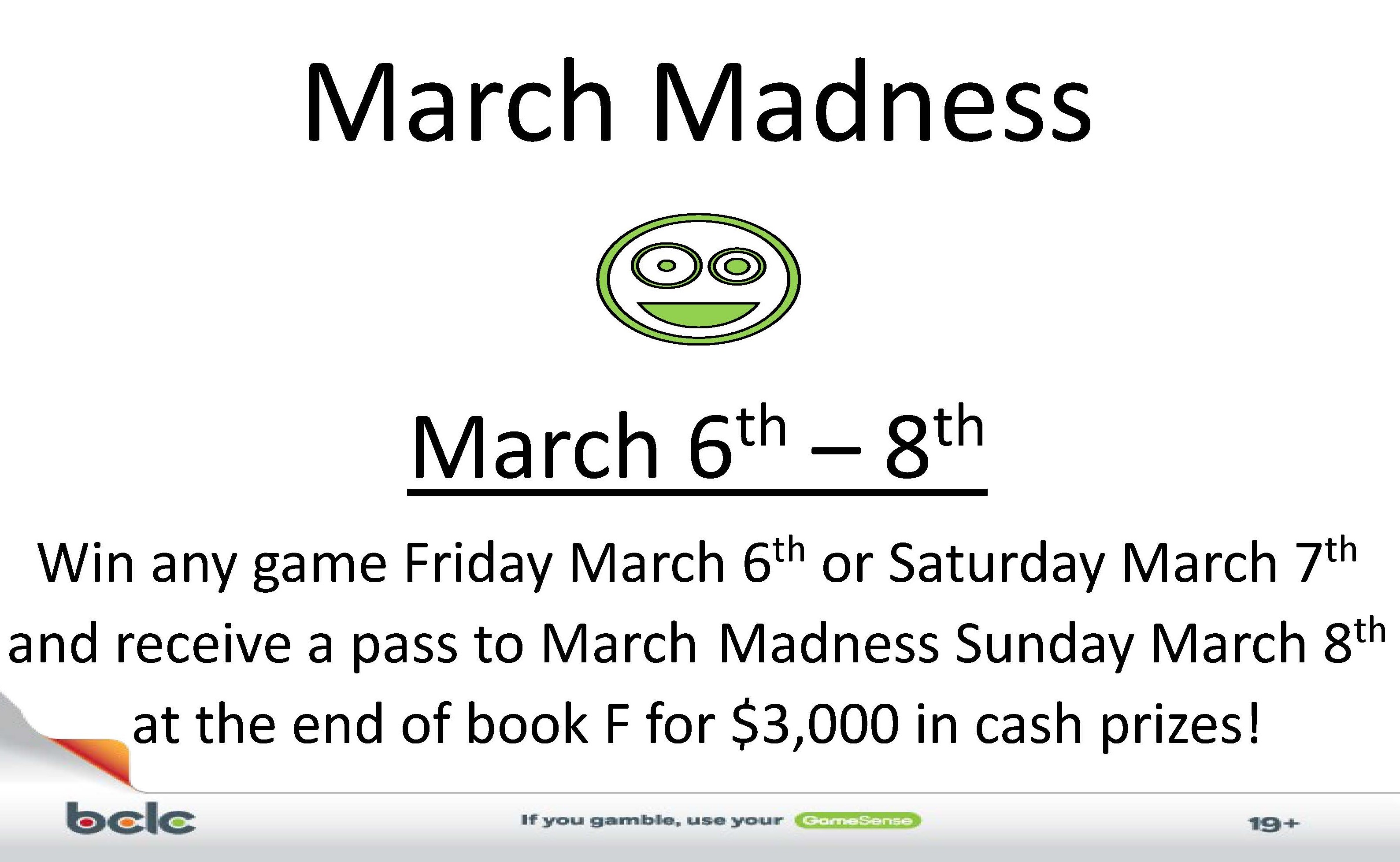 Win any game Friday March 6th or Saturday March 7th and receive a pass to March Madness Sunday March 8th at the end of book F for $3,000 in cash prizes!!!