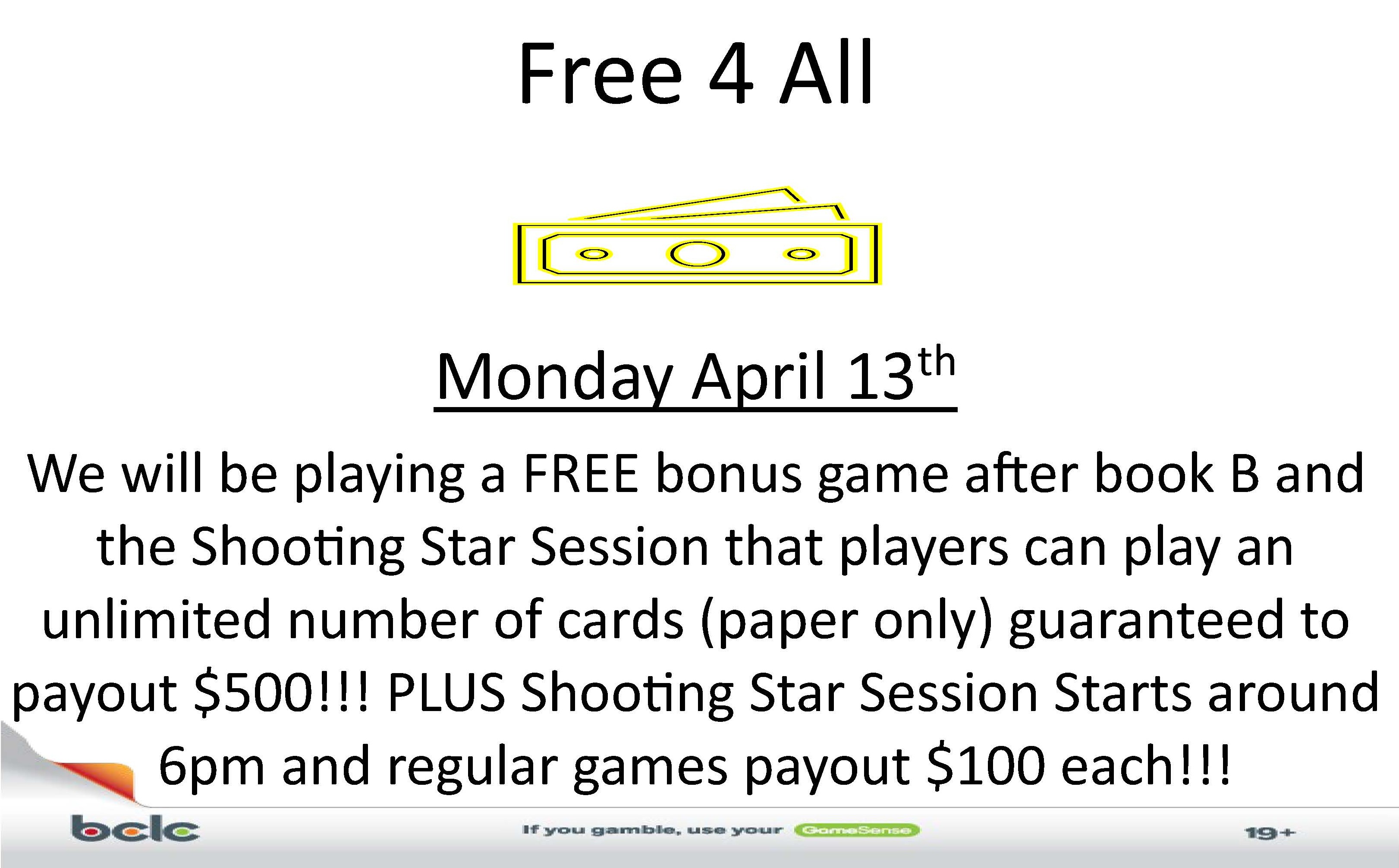 We will be playing 2 FREE games (after book B and the Shooting Star Session) that players can play an unlimited amount of cards (paper only) that pays $500!!!