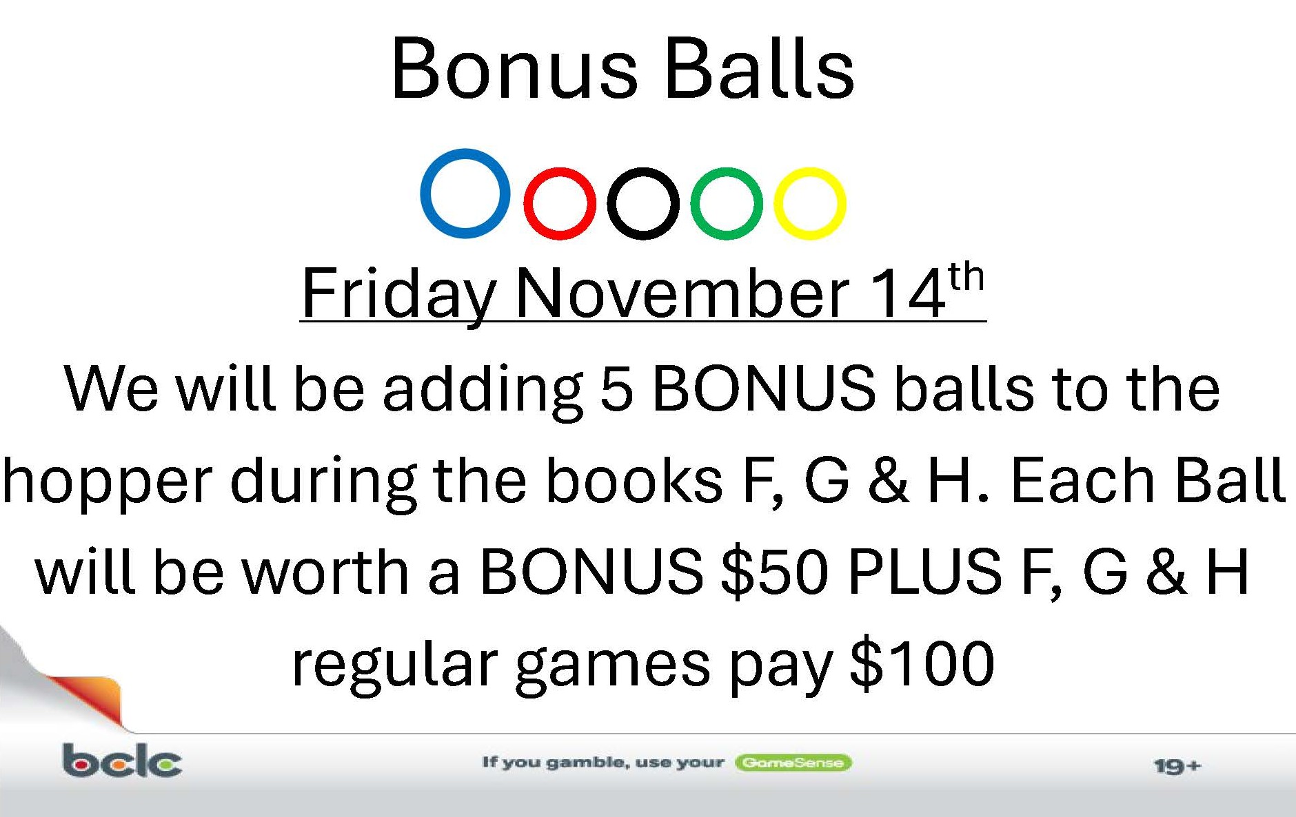 During books F, G & H we will be adding 5 bonus balls to the hopper that are each worth $50 for a BONUS prize up to $250 for each regular game PLUS books F, G & H payout $100!
