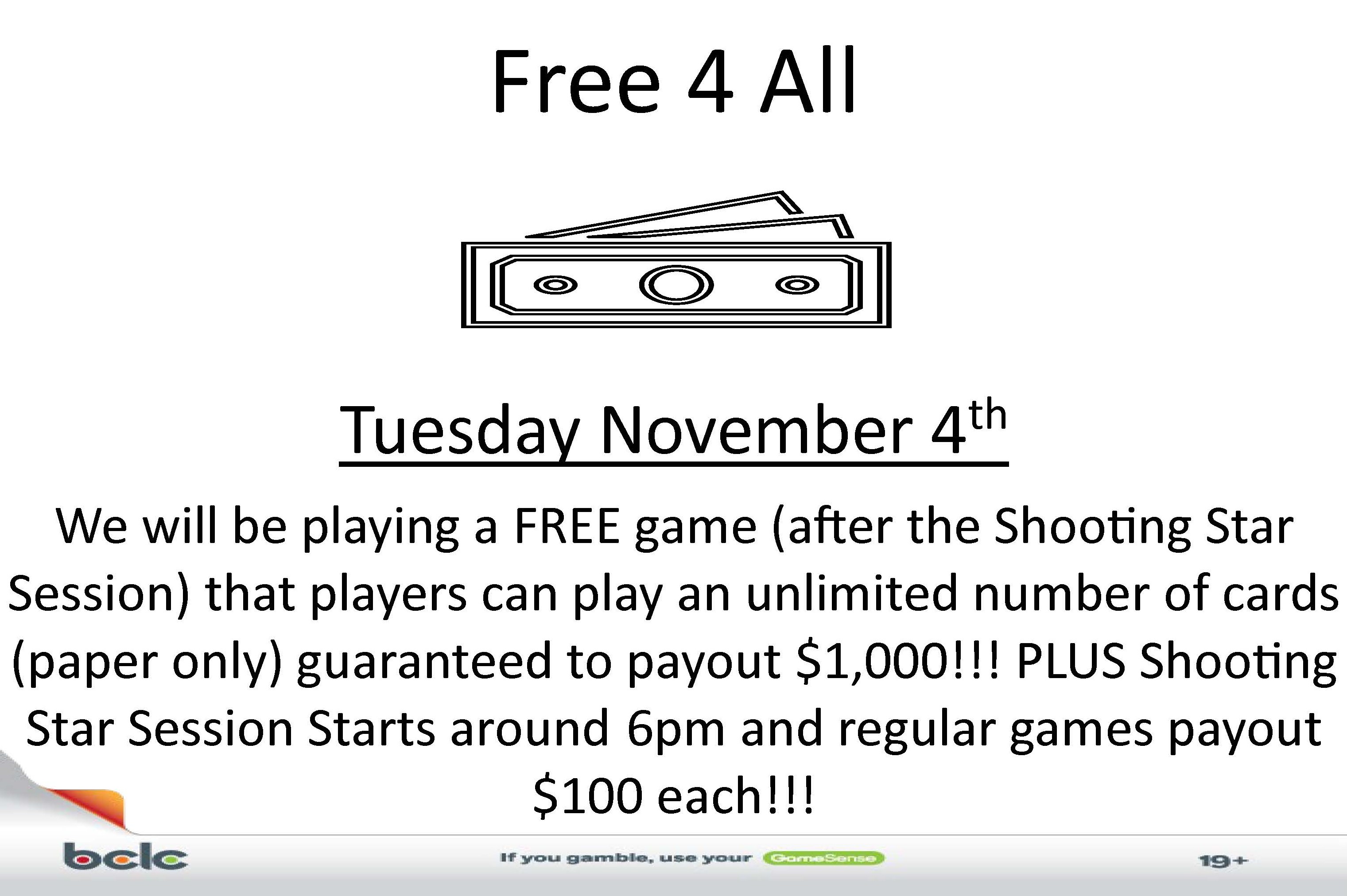 We will be playing a FREE game after the Shooting Star Session that players can play an unlimited amount of cards (paper only) for $1,000 in cash prizes!