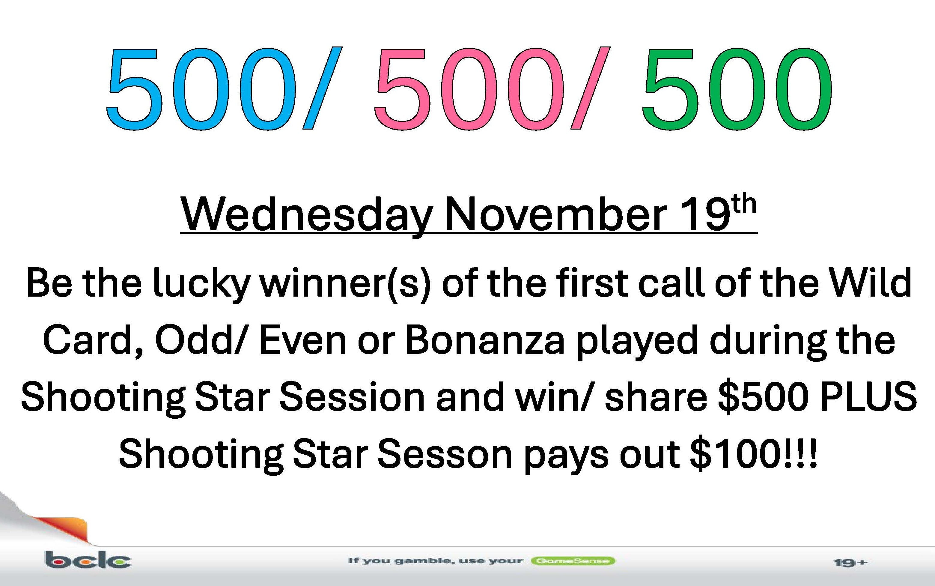 Be the lucky winner of the Wild Card, Odd/ Even or Bonanza played during the Shooting Star Session and win/ share the prize of $500!!!