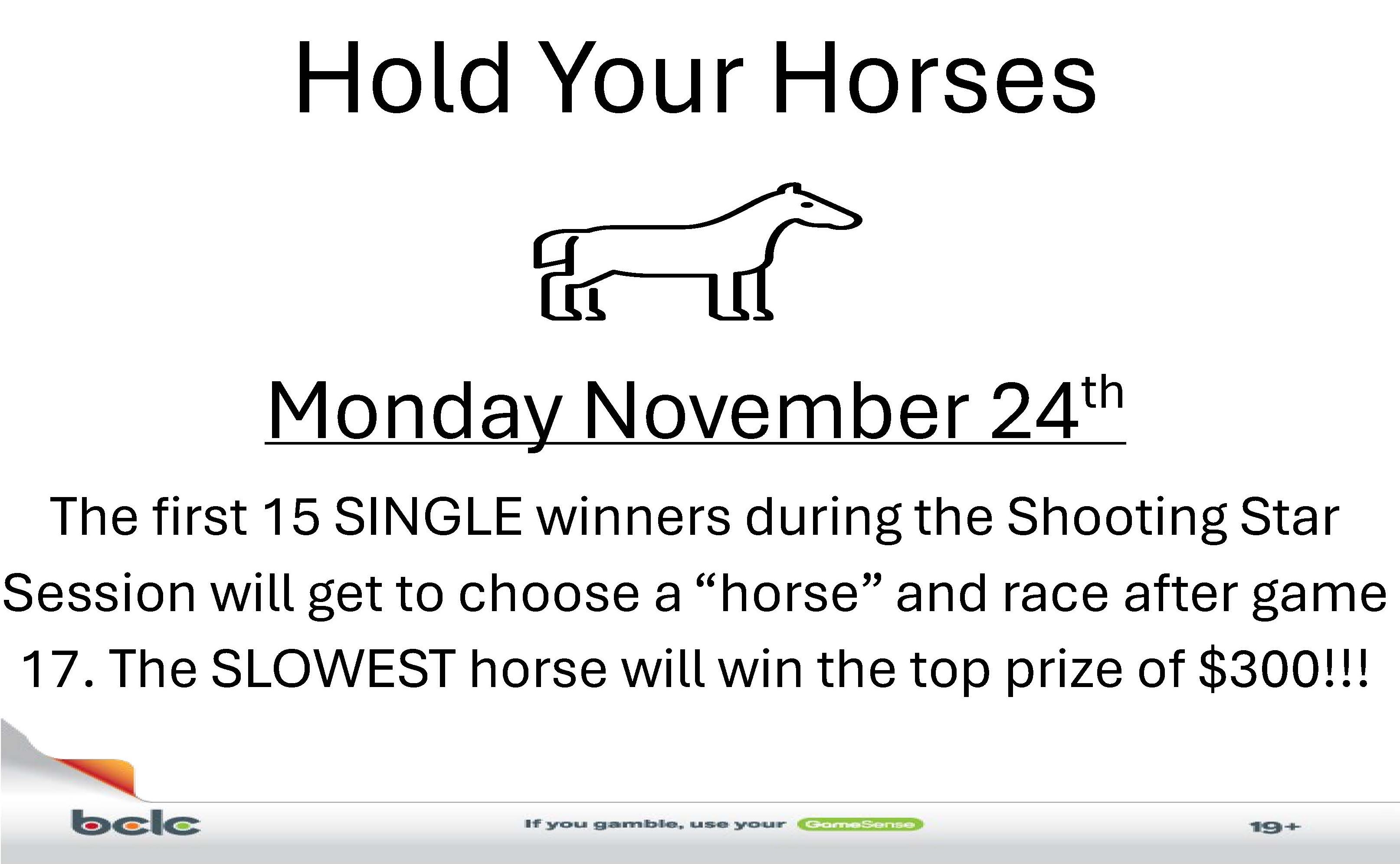 The first 15 SINGLE winners during the Shooting Star Session will get to choose a “Horse” and race after game 17. The SLOWEST horse will win the top prize of $300!!!