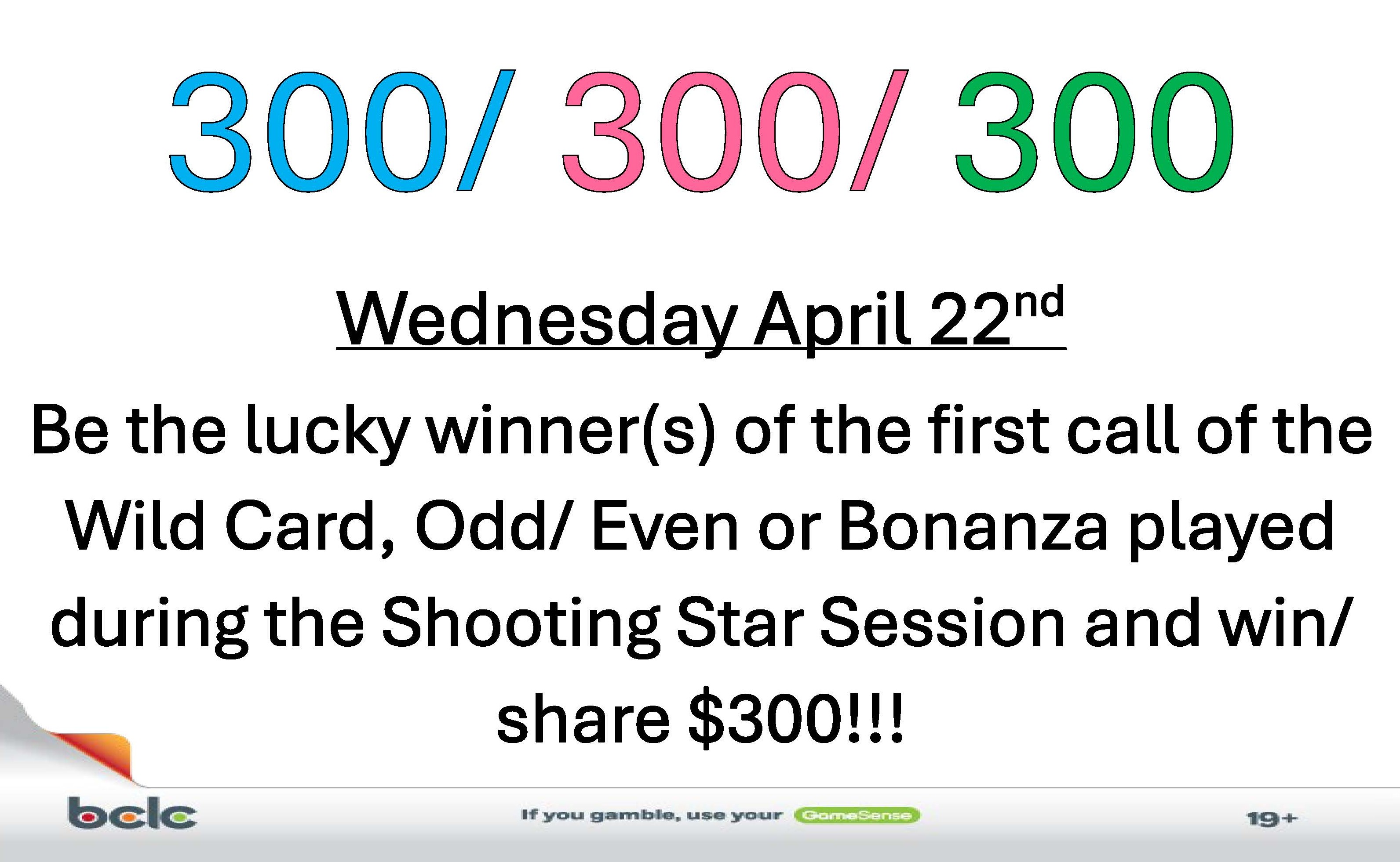 The Wild Card, Odd/ Even and Bonanza played during the Shooting Star Session will pay $300 each!!!