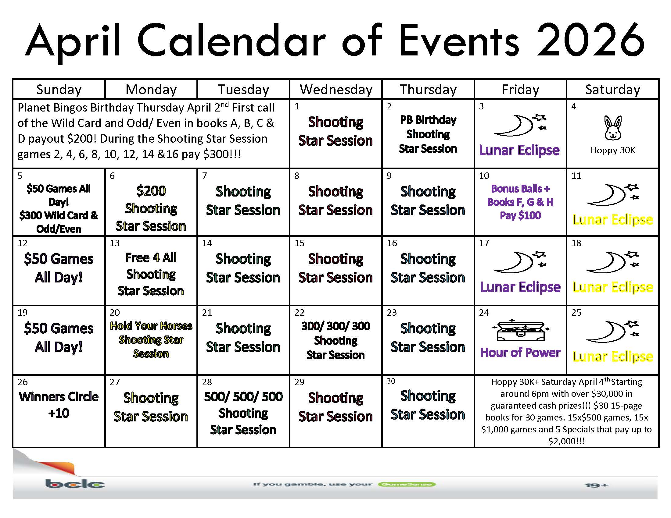 First call of the Wild Card & Odd/ Even in books A, B, C & D payout $200 PLUS games 2, 4, 6, 8, 10, 12, 14 & 16 during the Shooting Star Session payout $300 each!!!